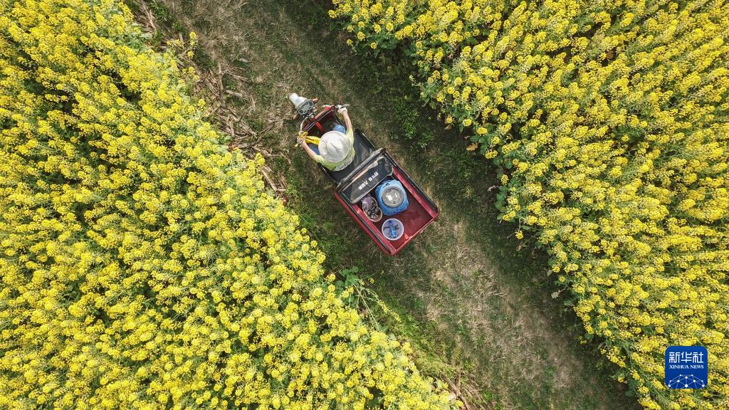 在常德市石門(mén)縣葉家坪村,葉金娥騎著(zhù)三輪車(chē)在油菜花叢中穿行(3月15日攝,無(wú)人機照片)。