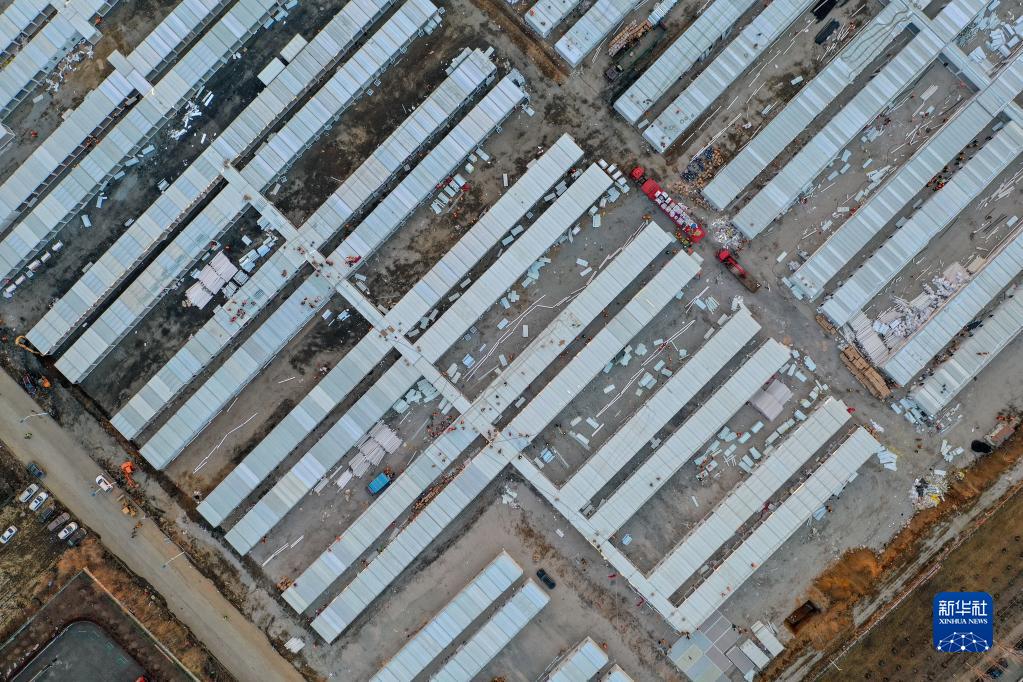 這是3月20日傍晚拍攝的吉林市高新南區隔離方艙建設現場(chǎng)(無(wú)人機照片)。