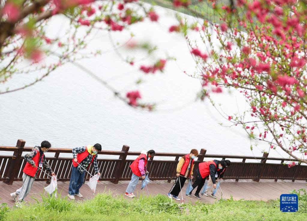 3月21日,在湖南省衡陽(yáng)市雁峰區東洲島上,南華大學(xué)土木工程學(xué)院志愿者在凈灘護水行動(dòng)中撿垃圾。