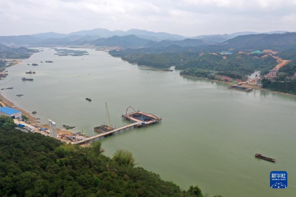 3月21日,在廣西上林至橫州高速公路建設施工現場(chǎng),工人們加班加點(diǎn)完成控制性工程——西津郁江特大橋水中承臺的澆筑作業(yè)。