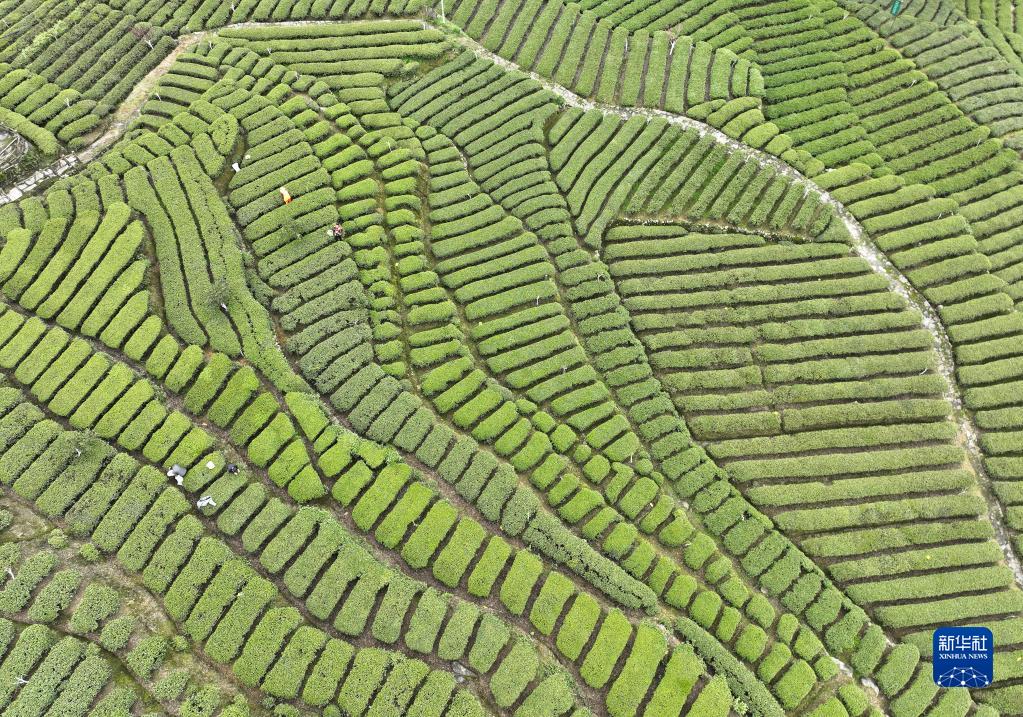 3月24日,茶農在湖北省宜昌市秭歸縣茅坪鎮松樹(shù)坳村一茶園采摘明前茶(無(wú)人機照片)。
