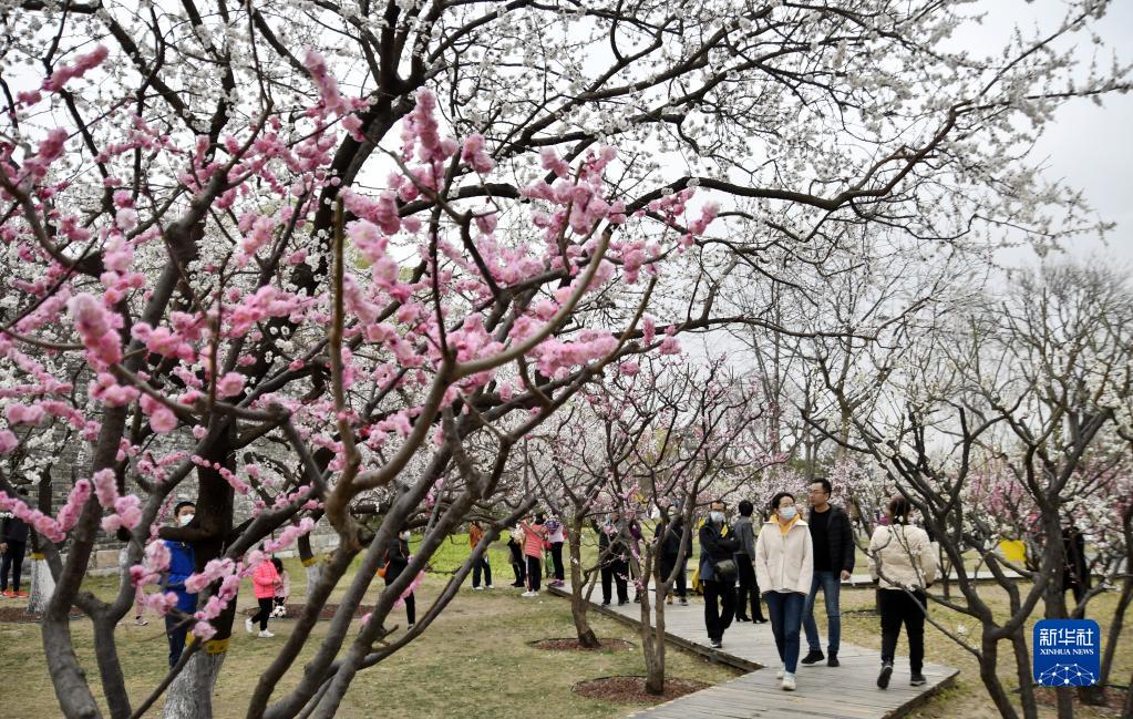 近期,北京市明城墻遺址公園內桃花盛開(kāi),吸引大批市民前來(lái)賞花踏青。