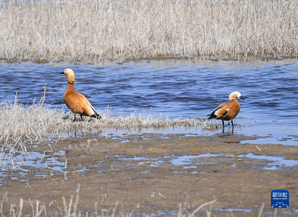 3月30日,兩只赤麻鴨在土默川平原上嬉戲覓食。