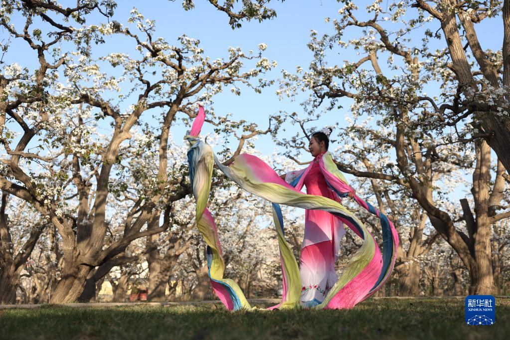 4月7日,景區工作人員在百年梨園的古樹(shù)下表演。