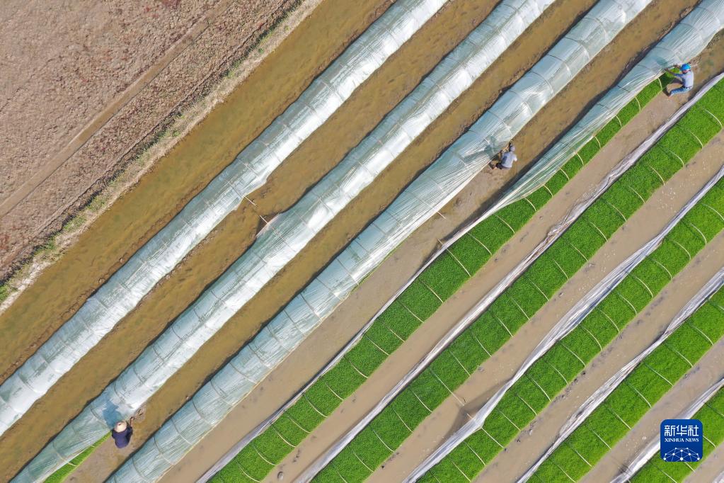 4月10日,湖南省常德市澧縣夢(mèng)溪鎮夢(mèng)溪寺社區,居民在早稻集中育秧點(diǎn)管護秧苗(無(wú)人機照片)。