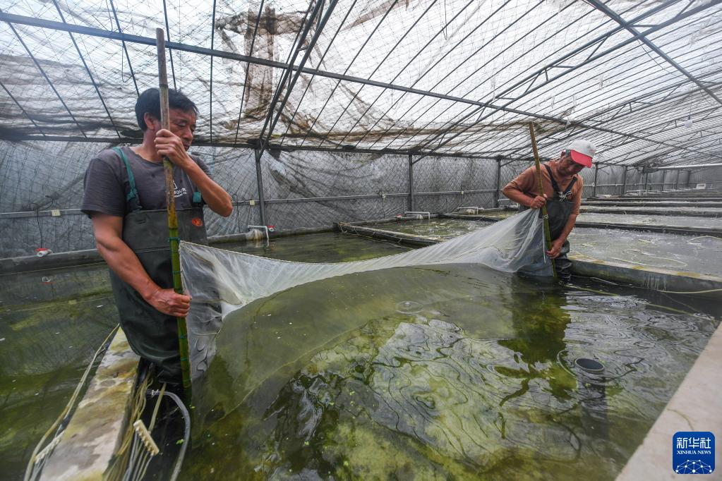 4月27日,在湖州市吳興區東林鎮保健村湖旺水產(chǎn)基地,工作人員拉網(wǎng)從育苗池內打撈魚(yú)苗。