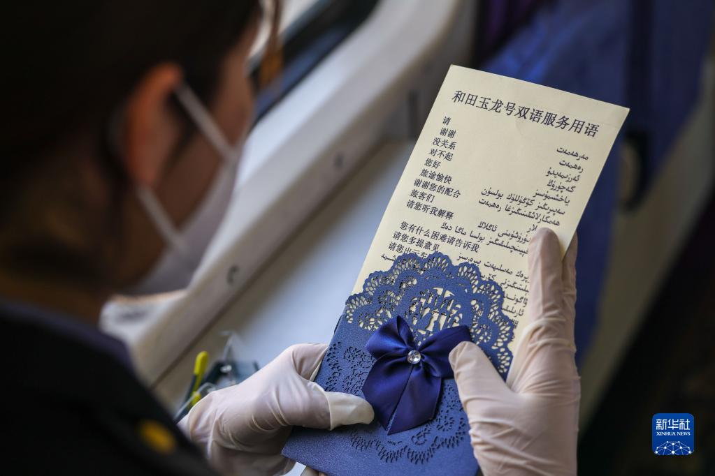 “和田玉龍號”列車(chē)員在休息間隙練習維、漢雙語(yǔ)服務(wù)用語(yǔ)(4月29日攝)。