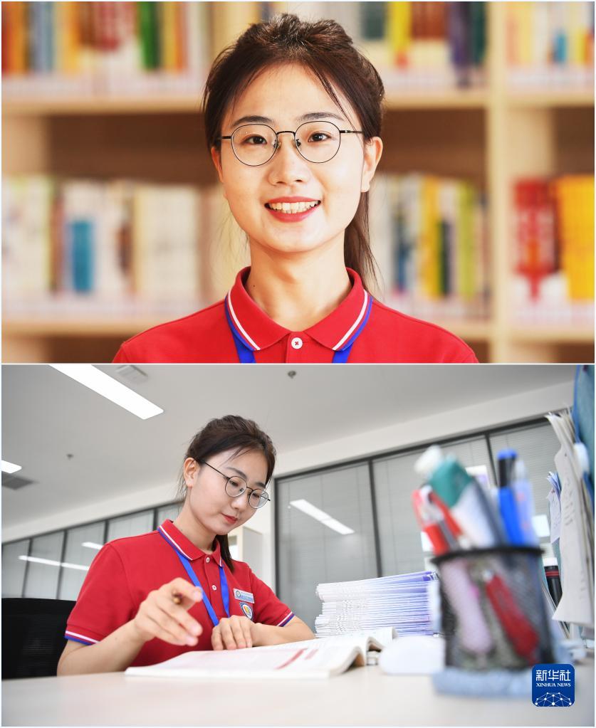 拼版照片:上圖為雄安容和德輝學(xué)校教師袁子薇(4月26日攝);下圖為袁子薇在雄安容和德輝學(xué)校辦公室備課(4月26日攝)。