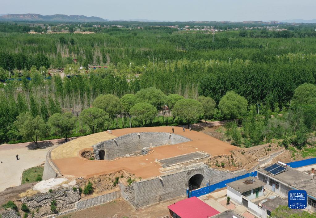 5月7日,工人在秦皇島市盧龍縣城的明代永平府城墻西門(mén)甕城修繕工程現場(chǎng)施工(無(wú)人機照片)。