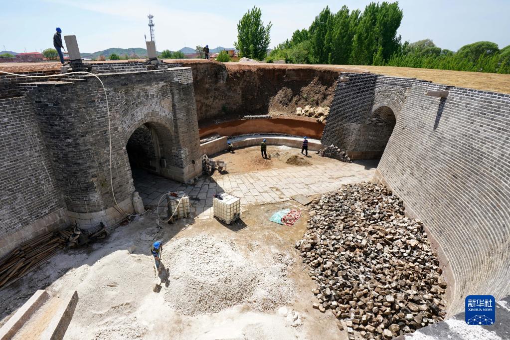 5月7日,工人在秦皇島市盧龍縣城的明代永平府城墻西門(mén)甕城修繕工程現場(chǎng)施工。