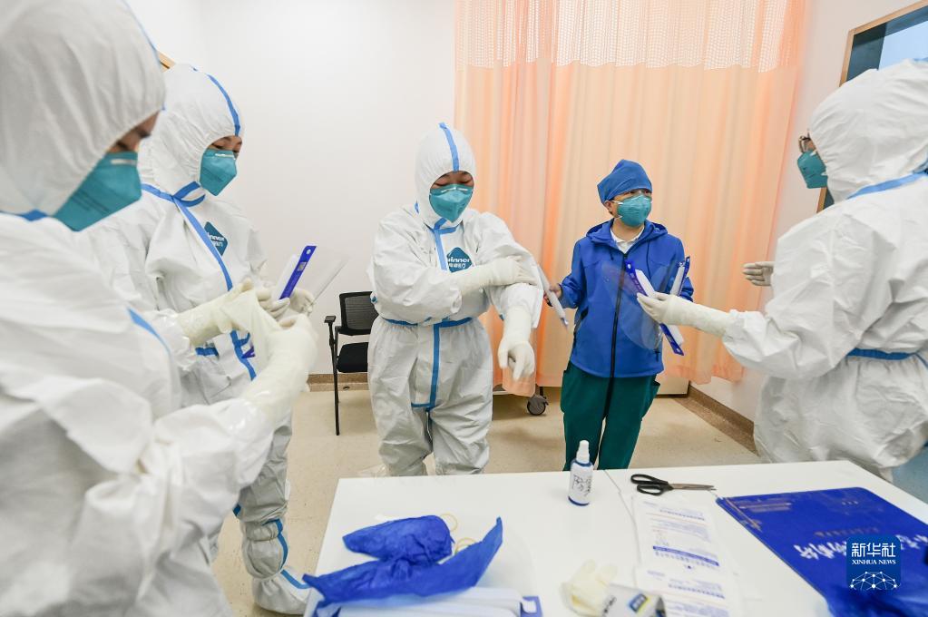 在同濟大學(xué)附屬上海第四人民醫院防護服穿戴區,胡鷹鷹(右二)監督指導醫療隊員穿防護服(5月13日攝)。
