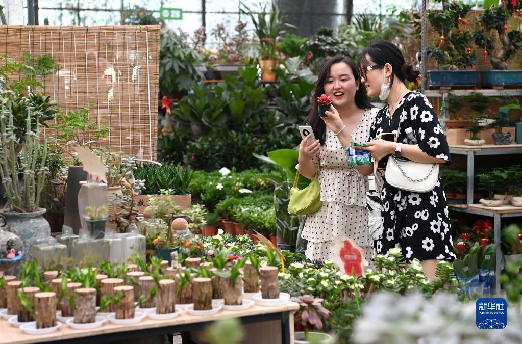 市民在西安際華3511文創(chuàng )科技園內的花市挑選花卉(5月20日攝)。