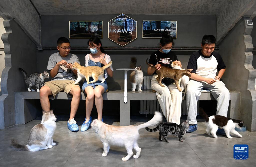 市民在西安際華3511文創(chuàng )科技園內的貓咖逗貓(5月20日攝)。