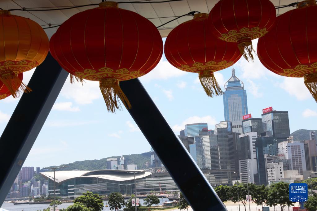 香港中環(huán)海濱長(cháng)廊紅燈籠高掛,喜迎香港回歸祖國25周年紀念日(6月23日攝)。