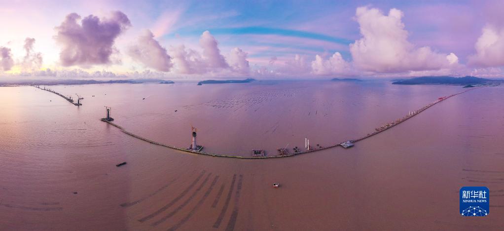 建設中的黃茅??绾Mǖ溃?月28日攝,無(wú)人機全景照片)。黃茅??绾Mǖ罇|起珠海市平沙鎮,西接江門(mén)市斗山鎮,橫跨珠江口崖門(mén)入??邳S茅海水域,線(xiàn)路全長(cháng)約31公里,預計2024年建成通車(chē)。