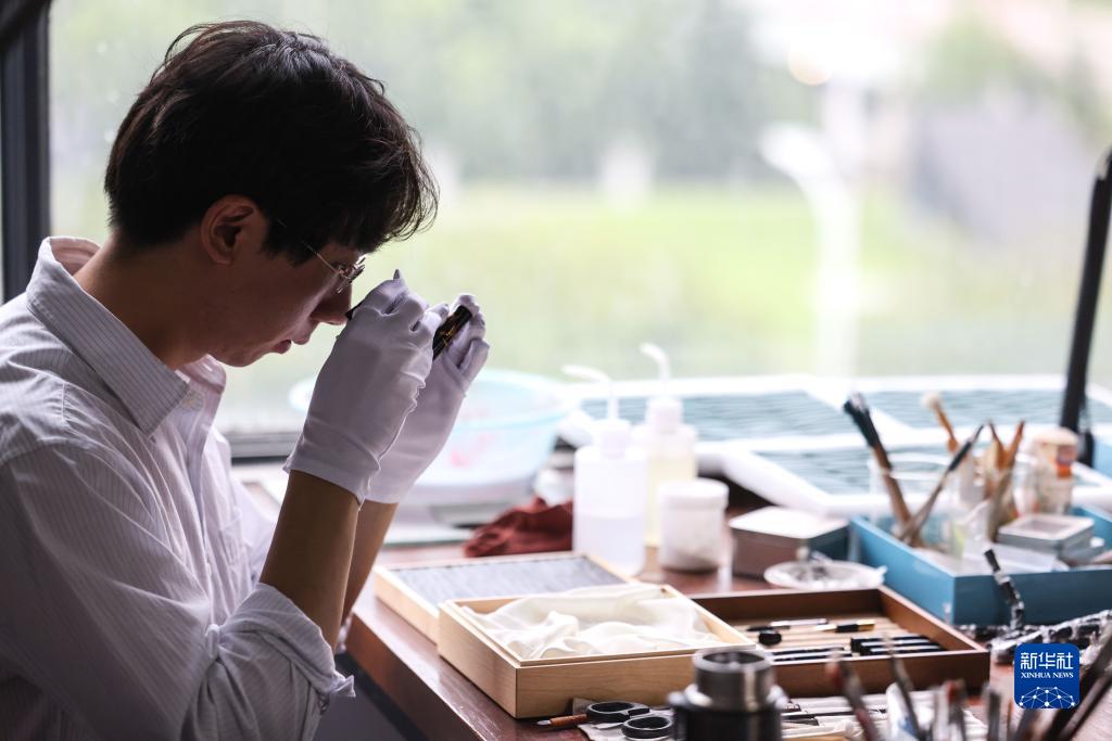 7月1日,袁建在位于貴州大學(xué)國家大學(xué)科技園的工作室用放大鏡查看鋼筆的筆殼成品。