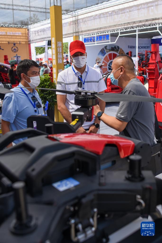 7月3日,在2022新疆農業(yè)機械博覽會(huì )上,與會(huì )者了解植保無(wú)人機。