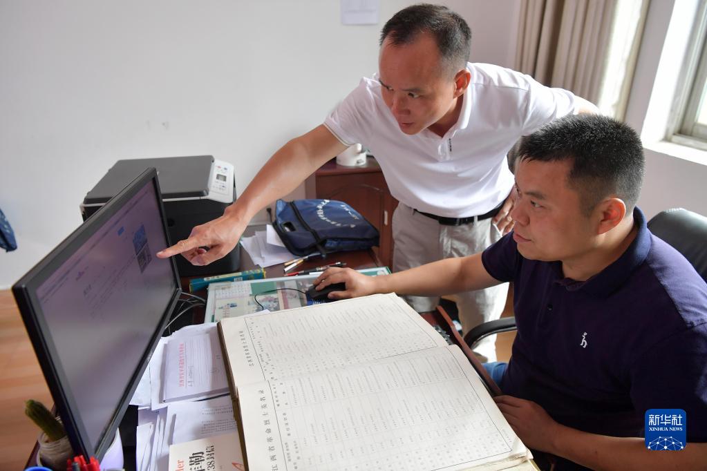 在江西省樂(lè )平市退役軍人事務(wù)局,程雪清(左)在工作人員幫助下上網(wǎng)查找烈士資料(7月6日攝)。
