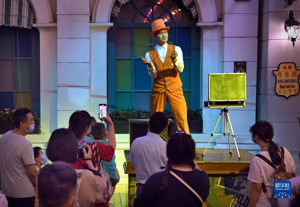 7月18日,游客在電影小鎮里觀(guān)看演員表演。