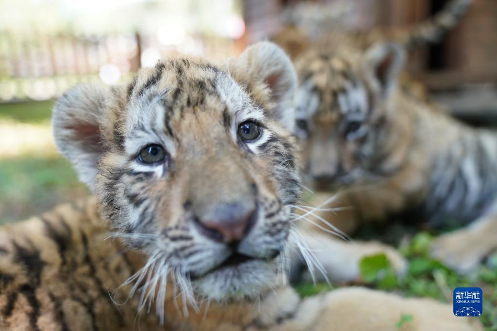 7月29日,東北虎幼虎在中國橫道河子貓科動(dòng)物飼養繁育中心活動(dòng)區玩耍。