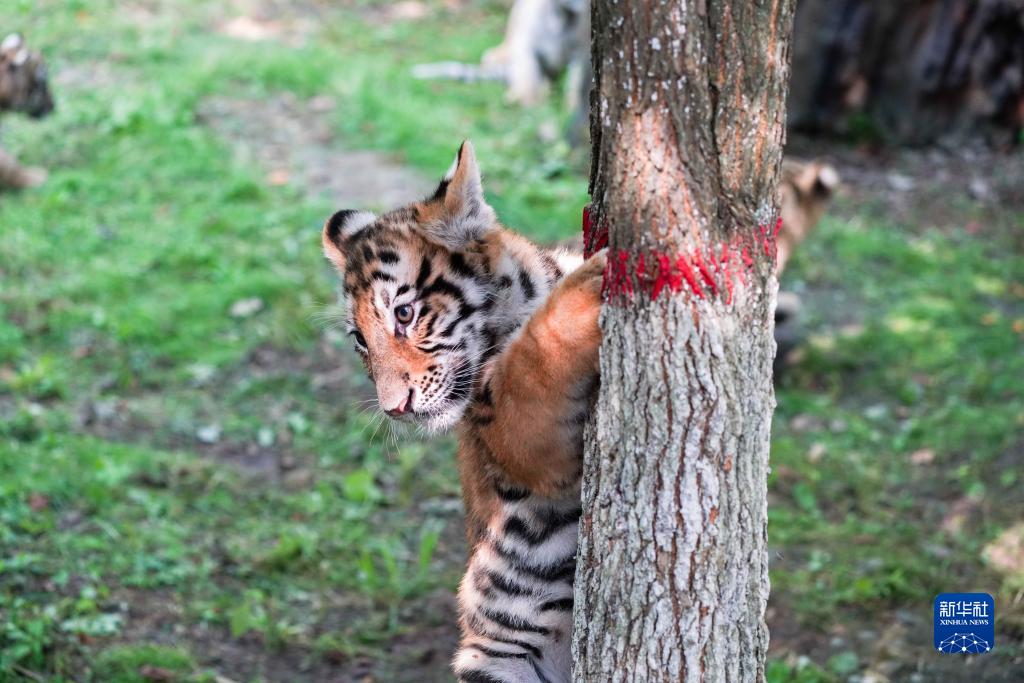 7月29日,東北虎幼虎在中國橫道河子貓科動(dòng)物飼養繁育中心活動(dòng)區玩耍。
