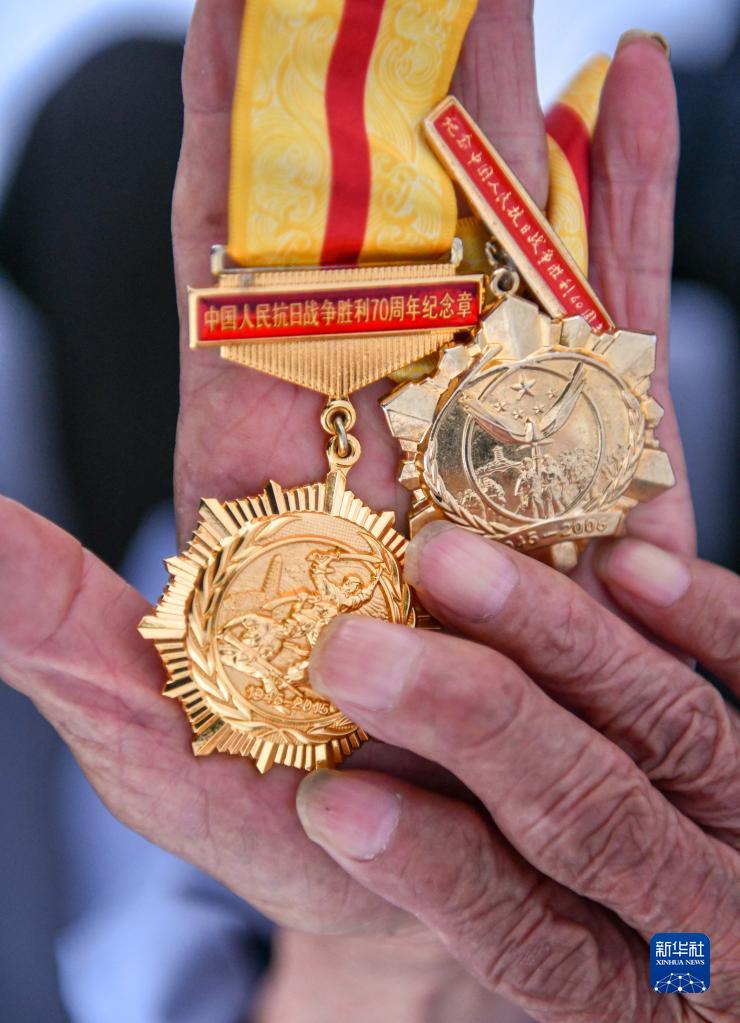 6月15日,在山東省淄博市沂源縣,抗戰老戰士胡德玖展示紀念章。