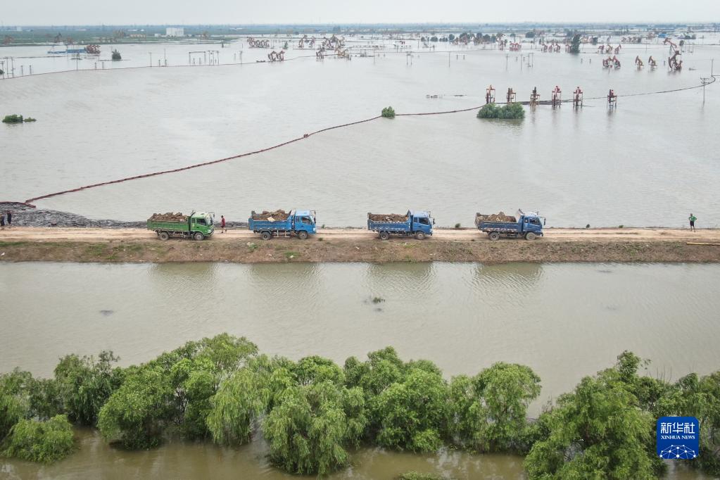 8月3日,運送搶險物料的車(chē)輛前往潰口處(無(wú)人機照片)。
