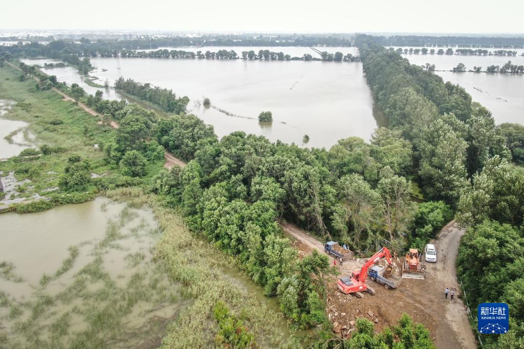 8月3日,參與搶險的工作人員使用大型機械設備運送搶險物料(無(wú)人機照片)。