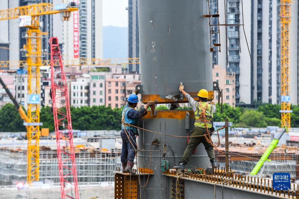 8月4日,建設者在廣州白云火車(chē)站二期工程施工現場(chǎng)吊裝鋼結構疊合柱。