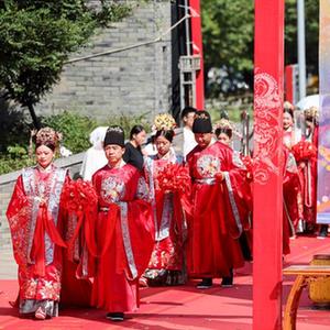 當日是七夕,2022(壬寅)年貴陽(yáng)孔學(xué)堂中華婚禮在貴陽(yáng)孔學(xué)堂舉辦,12對新人身穿中式婚服通過(guò)合巹禮、解纓結發(fā)、共書(shū)婚帖等方式完成傳統婚禮儀式。