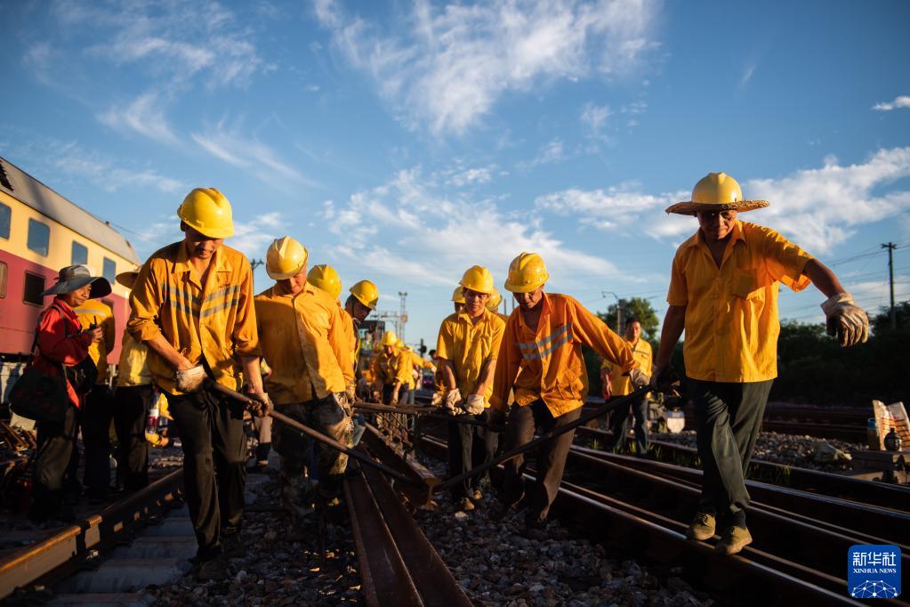 8月5日,在株洲北站編組場(chǎng),鐵路工人們移動(dòng)鐵軌。