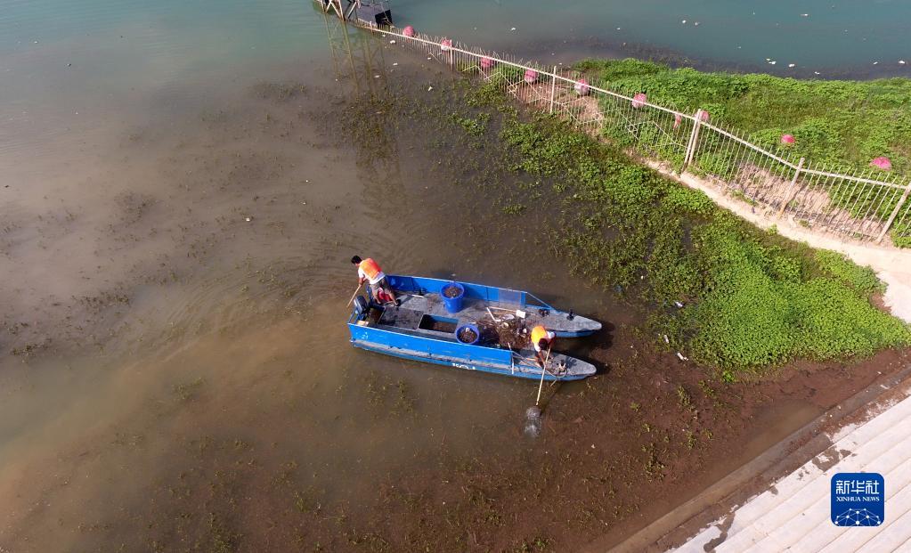 8月5日,劉家峽水庫工作人員駕船在河面上清理漂浮物(無(wú)人機照片)。