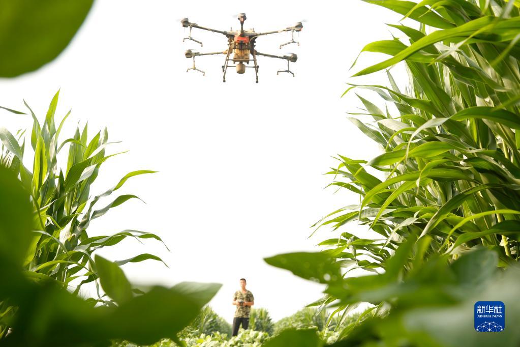 8月5日,在河北省邢臺市南和區閻里鄉一家農民合作社,農民操作植保無(wú)人機為玉米和大豆噴灑農藥、葉面肥。