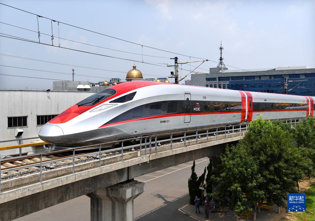 8月5日,一列雅萬(wàn)高鐵高速動(dòng)車(chē)組行駛在位于山東省青島市的中車(chē)四方股份公司環(huán)形試驗線(xiàn)上。