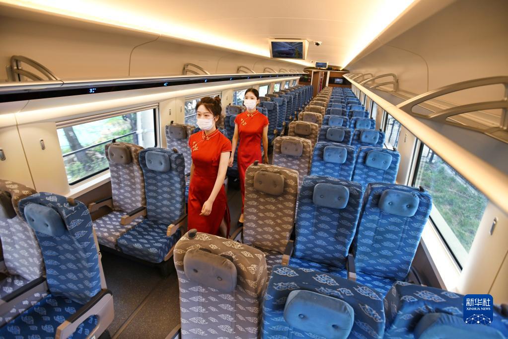 8月5日,在位于山東省青島市的中車(chē)四方股份公司,禮儀人員從雅萬(wàn)高鐵高速動(dòng)車(chē)組車(chē)廂內部經(jīng)過(guò)。