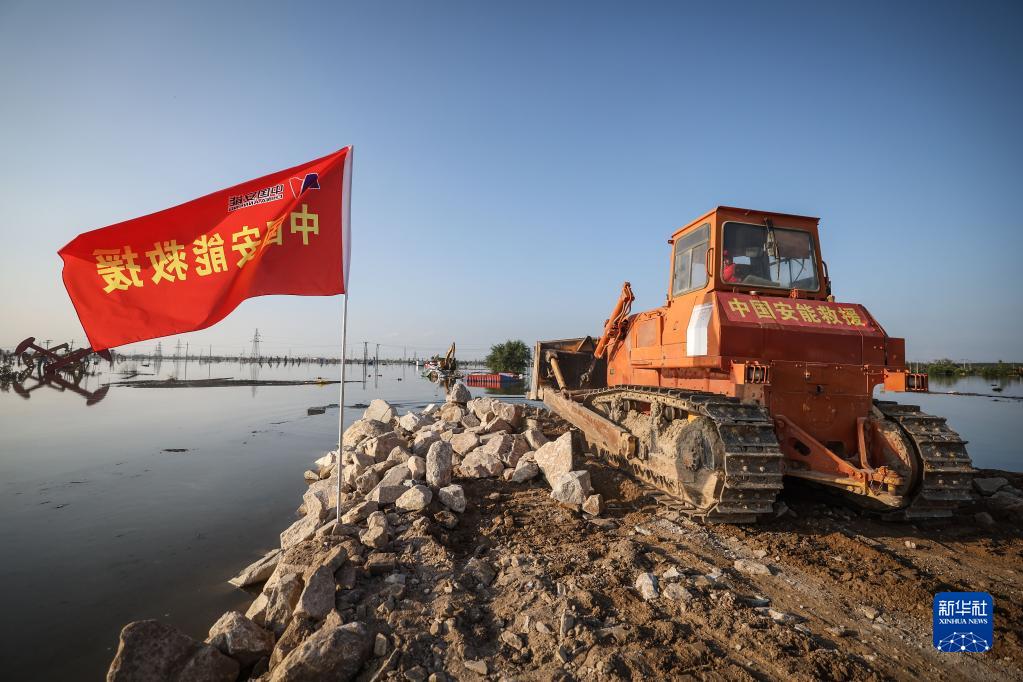 8月5日,中國安能集團搶險人員在潰口處駕駛推土機進(jìn)行封堵作業(yè)。