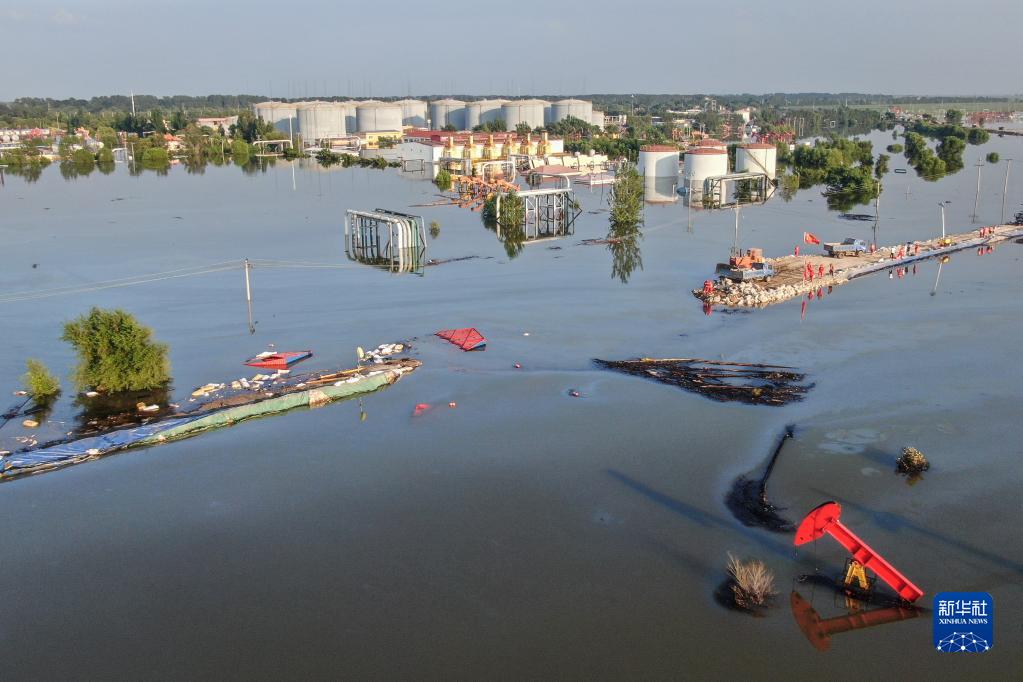 8月5日,搶險人員在潰口處進(jìn)行封堵作業(yè)(無(wú)人機照片)。
