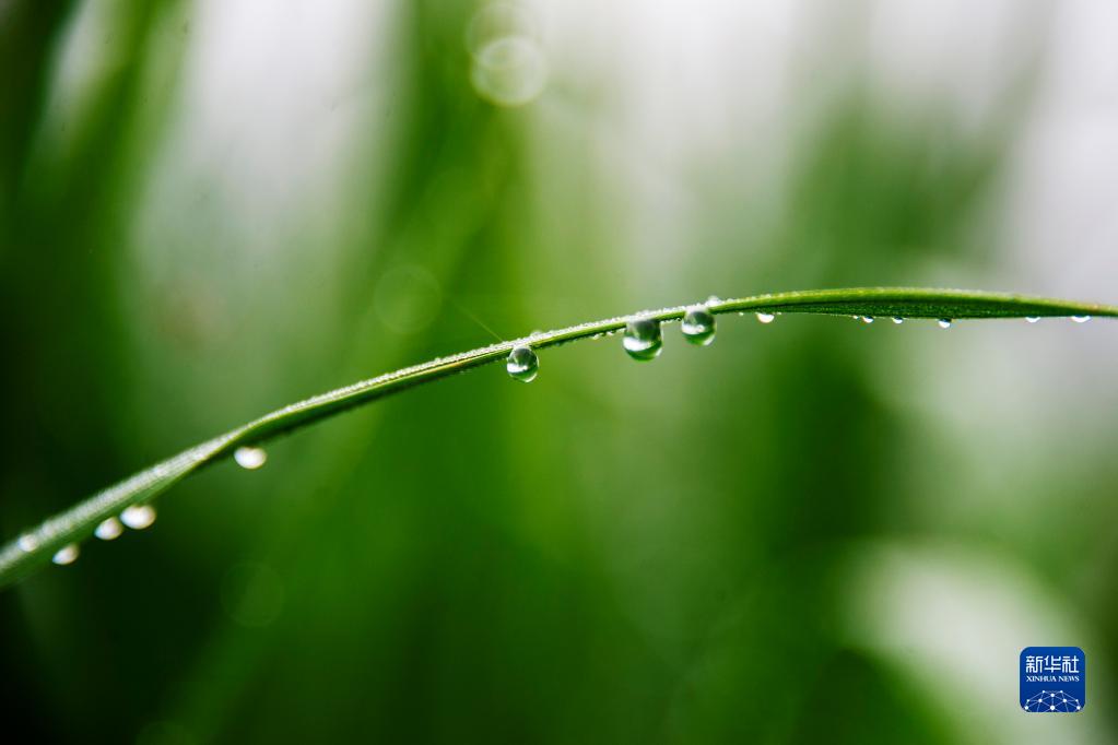 8月1日,在廣西靖西市新靖鎮東利村,稻葉上掛著(zhù)露珠。