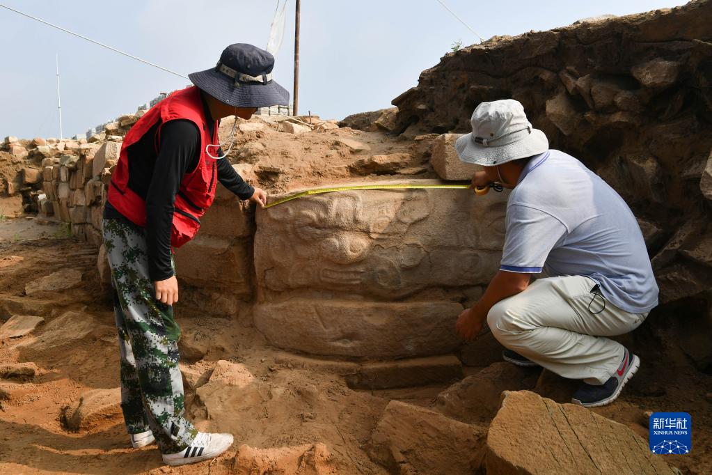 8月6日,考古人員對陜西神木石峁遺址皇城臺新近出土的石雕進(jìn)行測量。