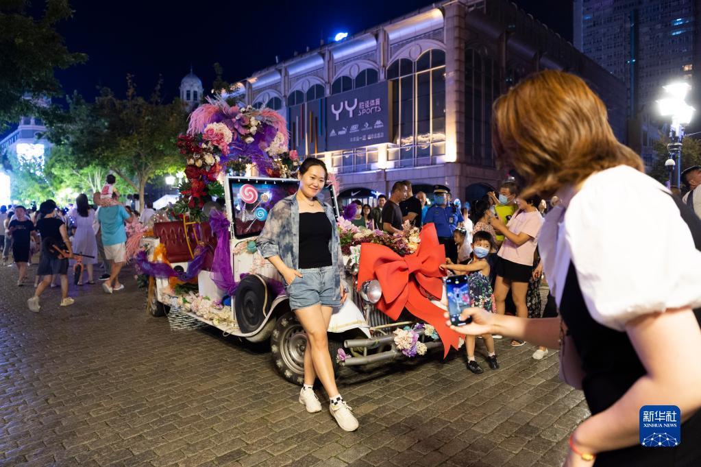 8月5日,在哈爾濱市中央大街,市民在花車(chē)前留影。