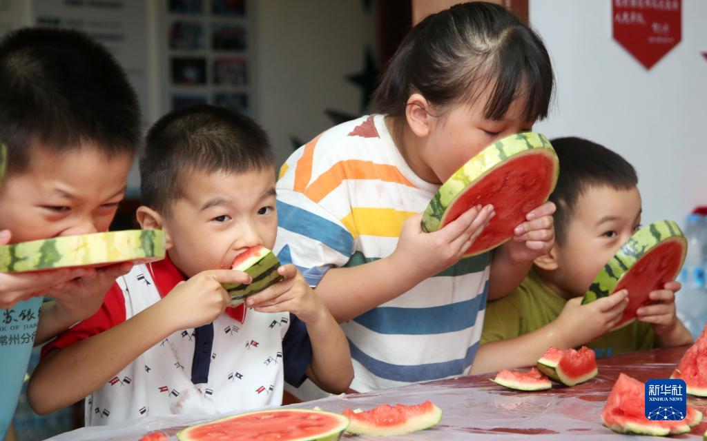 8月6日,在江蘇省常州市荷花池街道機械二村社區,小朋友們在吃西瓜“啃秋”。