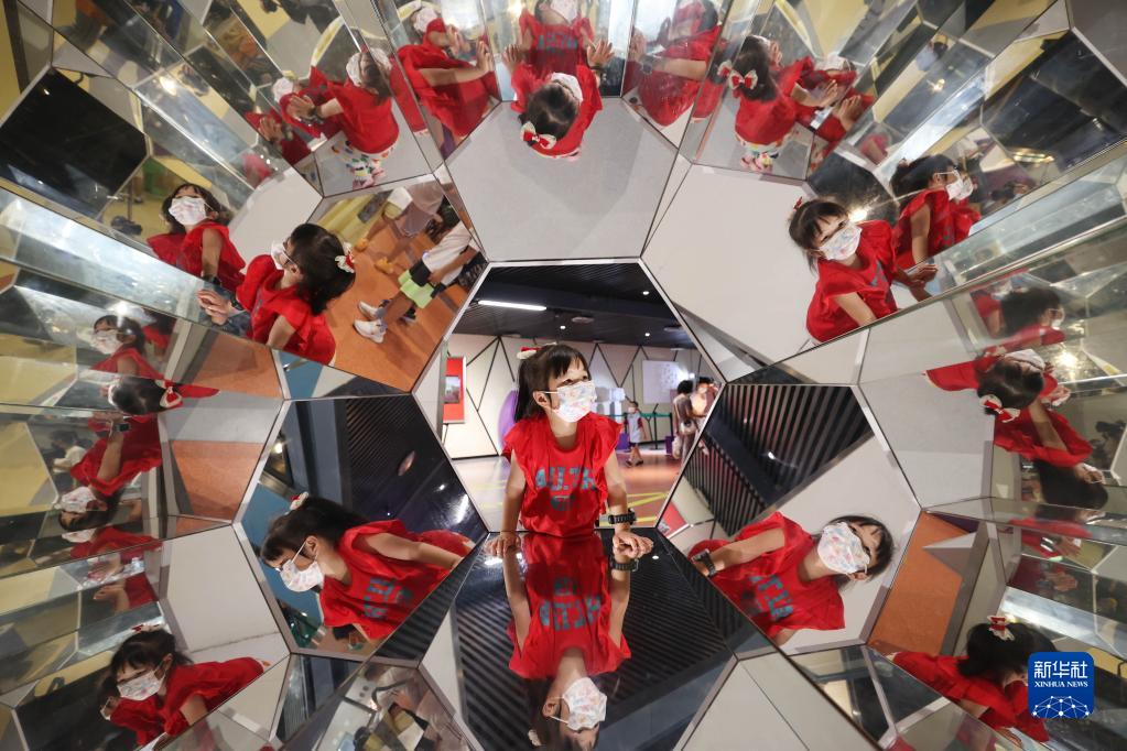 7月30日,一名小朋友在福建廈門(mén)科技館內體驗鈍角六面體鏡。