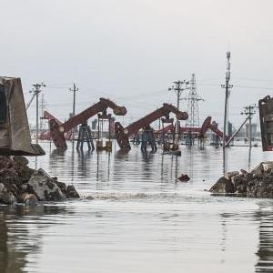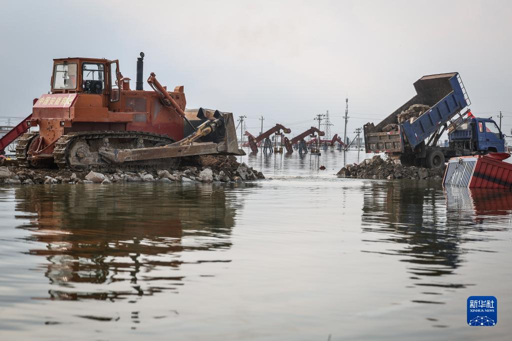 8月6日,搶險人員在潰口處進(jìn)行封堵作業(yè)。