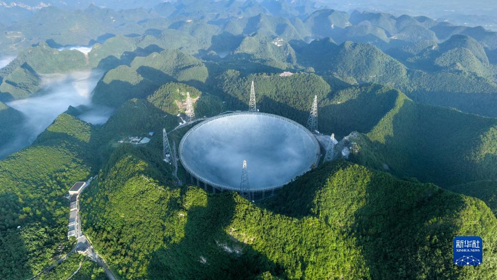 晨曦中的“中國天眼”全景(無(wú)人機照片,2022年7月25日維護保養期間拍攝)。