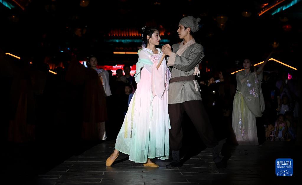 演員在西安周至水街煙火巷子內進(jìn)行情景劇表演(8月6日攝)。
