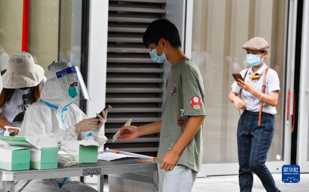 8月7日,居民在??谑旋埲A區萬(wàn)象城采樣點(diǎn)登記信息。