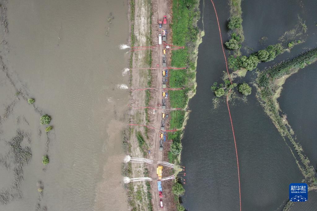 8月7日,搶險人員在遼寧盤(pán)錦繞陽(yáng)河左岸曾經(jīng)的河堤潰口北段進(jìn)行排澇作業(yè)(無(wú)人機照片)。