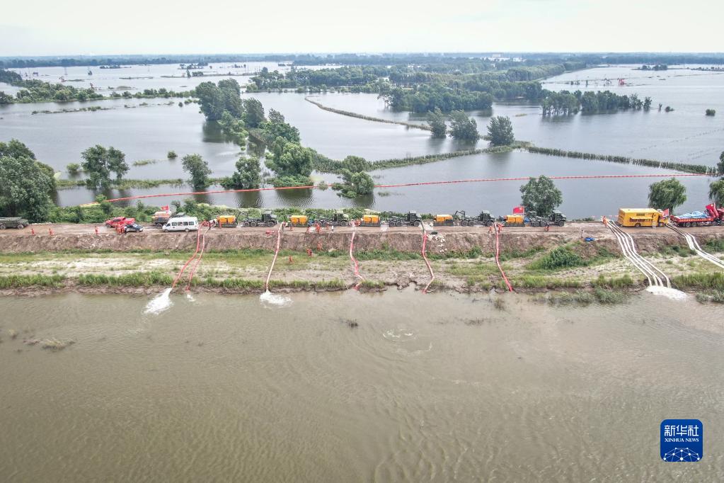 8月7日,搶險人員在遼寧盤(pán)錦繞陽(yáng)河左岸曾經(jīng)的河堤潰口北段進(jìn)行排澇作業(yè)(無(wú)人機照片)。