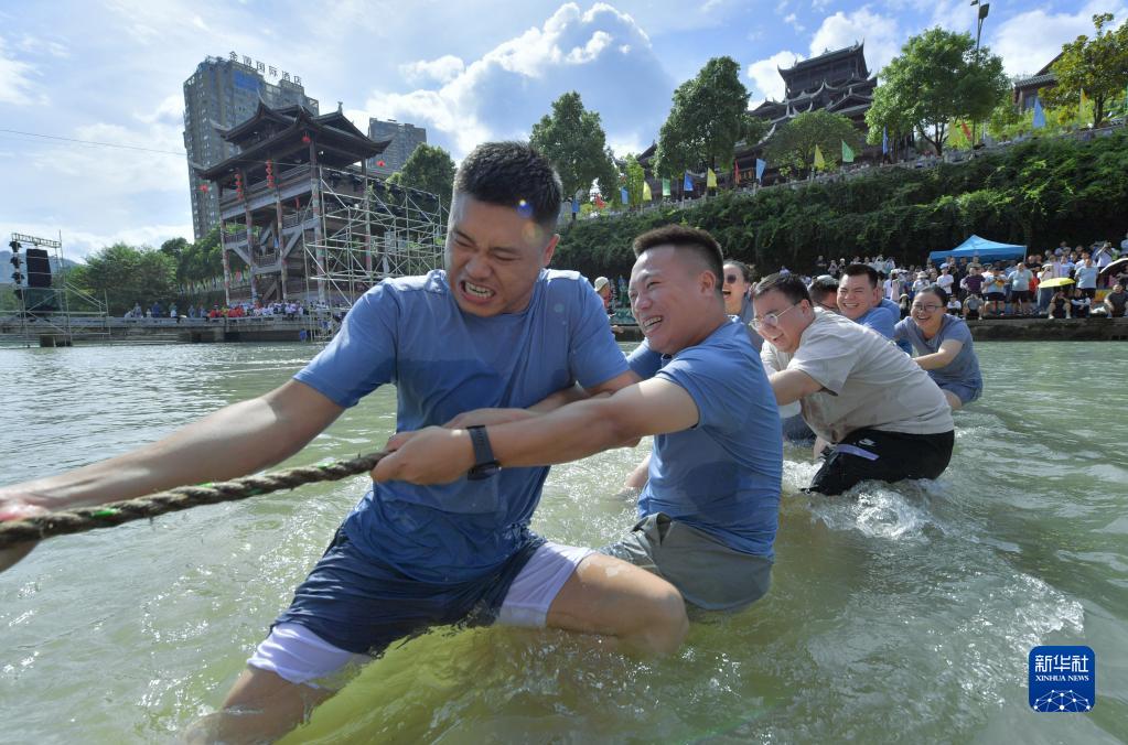 8月7日,在湖北省宣恩縣城貢水河上,選手們進(jìn)行“水上拔河”比賽。