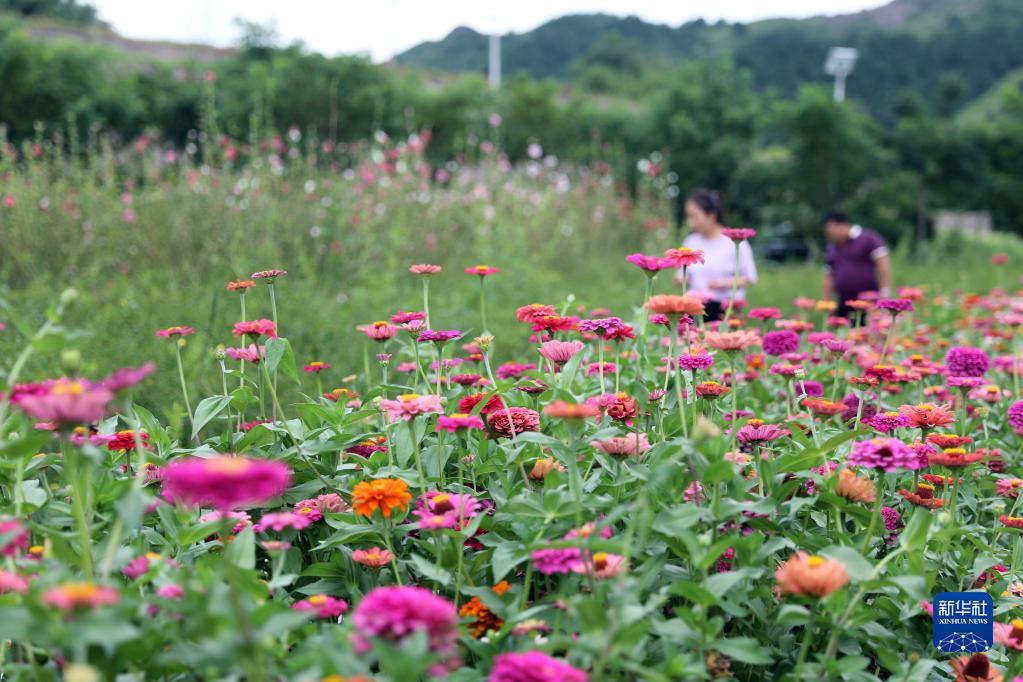 這是8月8日拍攝的灤平縣熱河中藥花海小鎮一景。